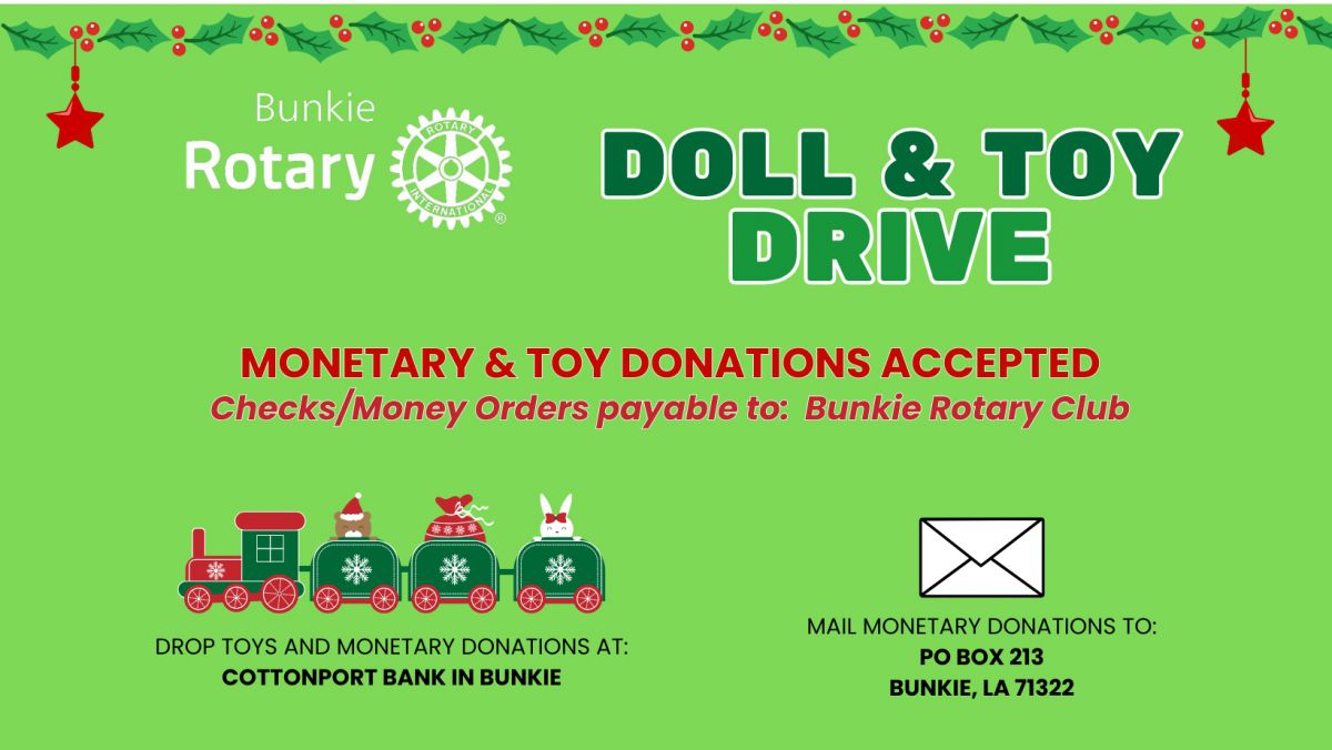 ![]() The Doll & Toy Committee are accepting donations at this time. Please make all checks payable to Bunkie Rotary Club, with a note in the memo "Doll & Toy Project." Members can give donations to Renee Tate or drop at the Cottonport Bank in Bunkie. |